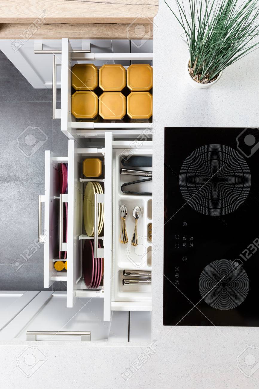 Top View Of Organized Kitchen Drawers And Electric Kitchen Stove